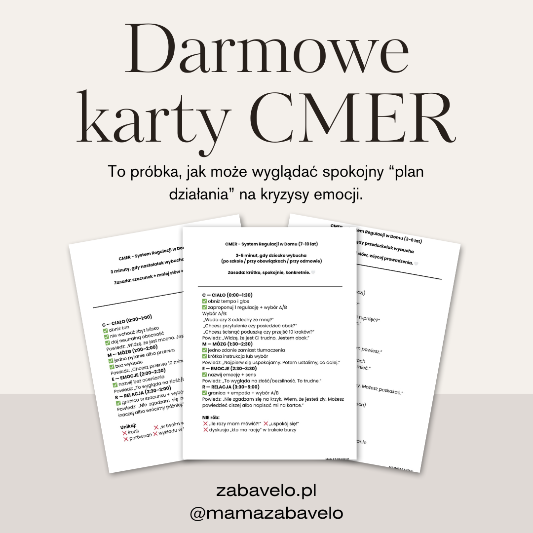 W tym pliku dostajesz mini-karty (wersję przykładową) – taką „ściągę”, która pokazuje, jak można reagować, kiedy emocje rosną (złość, płacz, krzyk, „nie!”).