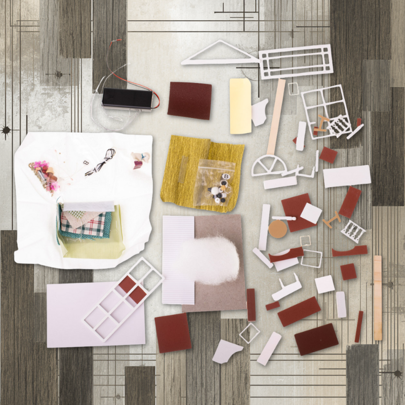 Zawartość zestawu – elementy konstrukcji salonu, elementy wyposażenia i aranżacji wnętrza, klej oraz instrukcja złożenia